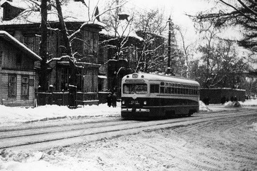 Бывшая дача в Покровском-Стрешневе (Авиационная улица). 6-й трамвай следует из Тушина к Соколу. Фото из архива Александра Шанина, 1968 год.