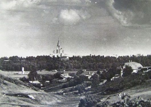 Живописно расположенное село Крылатское. Видны МГУ и ниже — главный дом усадьбы Кунцево. Фото 1962 года из архива Александра Филатова.
