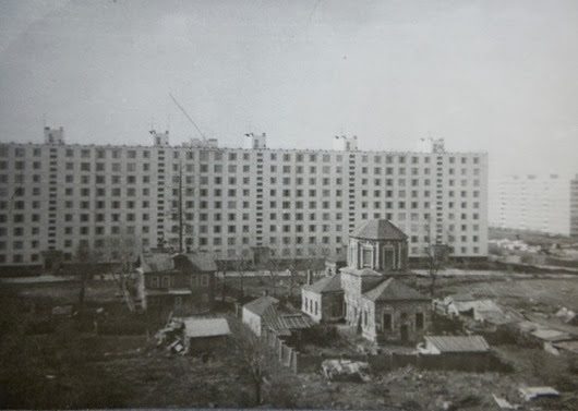 Последние остатки села Черёмушки (вид с улицы Шверника). Ещё стоит обезглавленная сельская церковь… Фрагмент панорамы 1962 года.