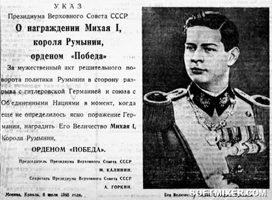 Король Румынии Михай I Гогенцоллерн-Зигмаринген 23 августа 1944 года арестовал сотрудничавших с гитлеровской Германией членов правительства Румынии. За этот поступок Михай 6 июля 1945 года был награждён орденом «Победа» с формулировкой «За мужественный акт решительного поворота политики Румынии в сторону разрыва с гитлеровской Германией и союза с Объединёнными Нациями в момент, когда ещё не определилось ясно поражение Германии».