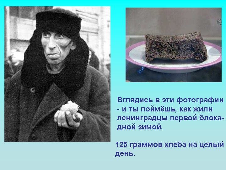 Придите сегодня домой, отрежьте даже эти 250 «рабочих» грамм чёрного хлеба и представьте, что только этот кусочек будет вашей едой каждый день. И всё! Ни колбасы, ни сыра, ни макарон, даже картошки не будет. И при этом вам надо ходить каждый день на работу — на завод, ремонтировать танки по 10-12 часов, потом идти обратно домой, искать дрова для буржуйки, кормить чем-то детей, престарелых родителей, таскать воду в вёдрах и бидонах по нескольку километров по заснеженным улицам. А утром часов в 6 в мороз до 20 градусов опять несколько километров до завода. И при этом верить в Победу. Вы сможете?