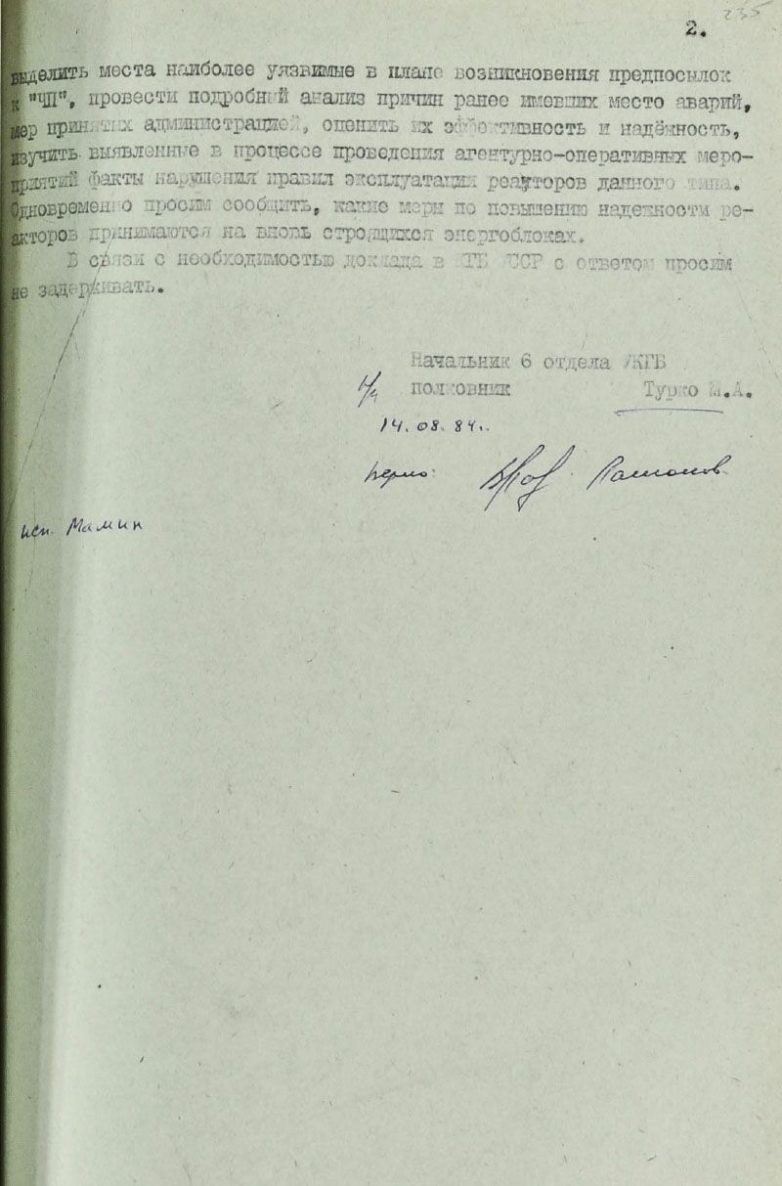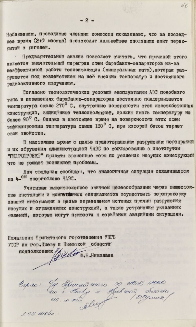 Докладная записка начальнику УКГБ СССР по Киеву и Киевской области Бандуристому ИМ.З. об аварийной ситуации на 3 и 4 энергоблоках ЧАЭС. 1984 год, за два года до апрельской катастрофы.