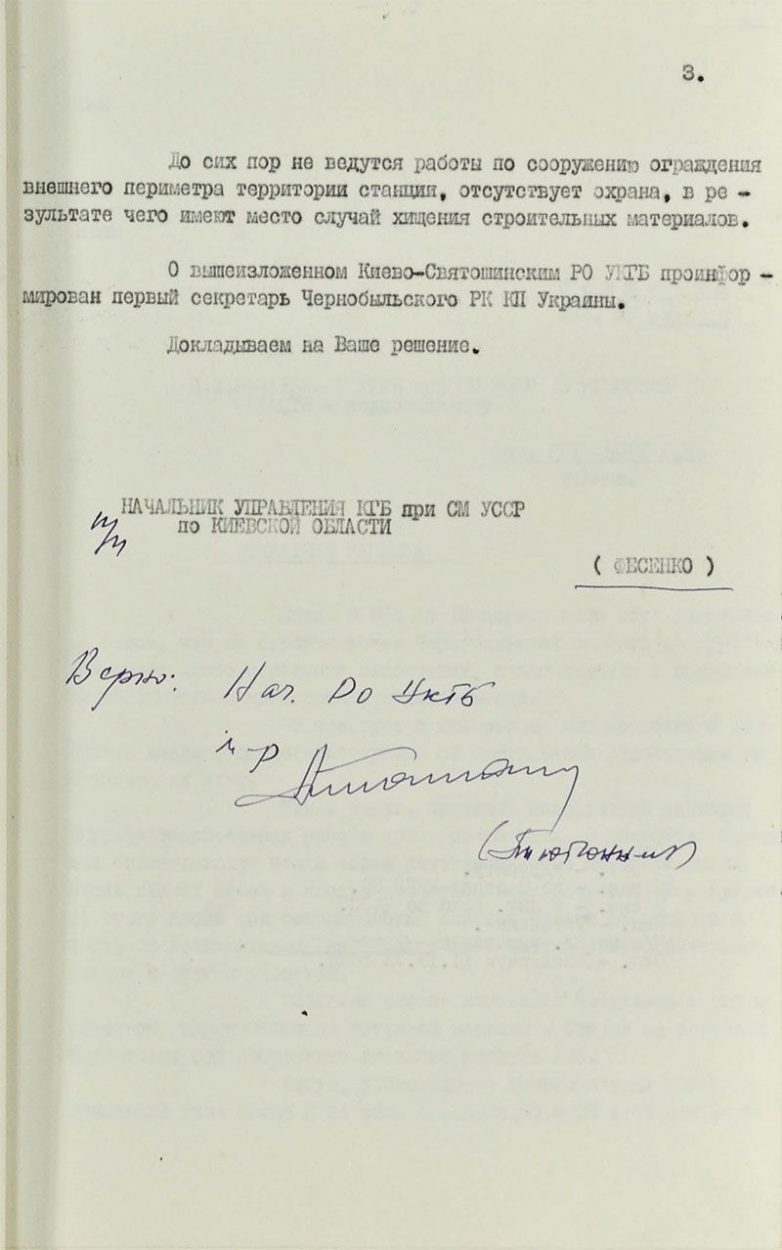 Документ номер три — весьма объемная докладная записка на имя начальника управления КГБ СССР по Киеву и Киевской области. Уже в первом абзаце текста говорится о серьезных нарушениях в строительстве станции, которые в дальнейшем могут привести в том числе и к авариям.