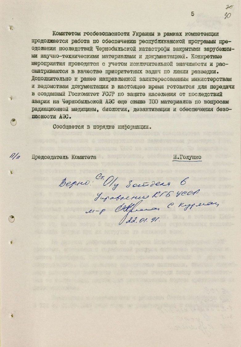 Объемная и очень интересная докладная записка, в которой говориться о многократном занижении реальных пострадавших от чернобыльской аварии, об ошибочном определении состояния разрушенного реактора («комиссия определила как „ядерно-опасное“, но сейчас никаких сведений о состоянии нет»).
