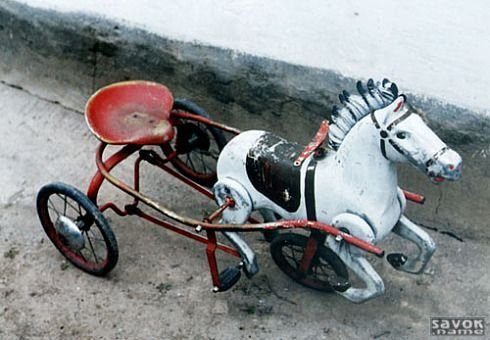 Конь педальный был не совсем игрушкой, а, скорее, полноценным транспортным средством для детей. Давался напрокат в городских парках. Управлялся вожжами. При движении сучил ногами. Ездил побыстрее, чем педальные автомобильчики.