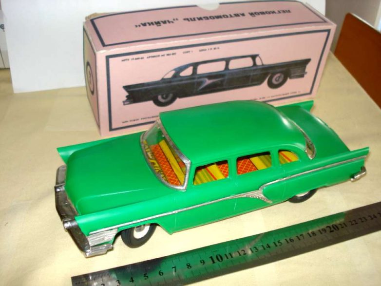 Электромеханическая игрушка автомобиль лимузин ,, Чайка ,, Газ-13 производства МЗМЗИ 60-х годов ( МОСКОВСКИЙ ЗАВОД МЕХАНИЧЕСКОЙ ЗАВОДНОЙ ИГРУШКИ министерства лёгкой промышленности РСФСР, Росглавигрушка ), 25 сантиметров, масштаб 1:22, цена 3 рубля 80 копеек