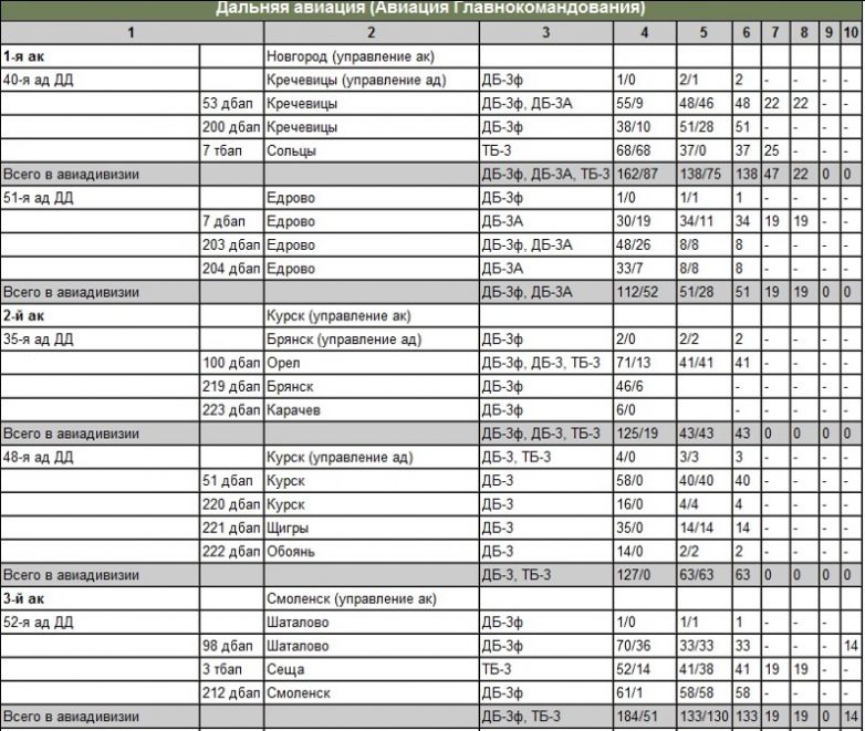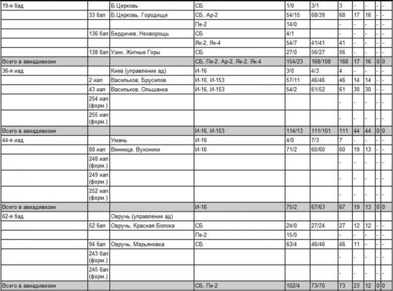 Сегодня достаточно точно известно, что СССР имел к началу войны около 16000 только боевых самолетов. На момент нападения СССР имел в западных округах около 10700 самолетов всех типов, противник, на линии соприкосновения, около 4800 только немецких машин. Т.е., перевес бумажный СССР составлял более чем в 2 раза. Но то бумажный. Представленные таблицы дают информацию совершенно другую информацию. О выделенных для прикрытия границы 8342 самолётах ВВС (без учёта авиации флота). Для которых было подготовлено 7222 экипажа. Правда, 1173 самолёта нуждались в ремонте. Что в принципе нормально. Самолёты всегда должны быть с запасом. Так что, теоретически только 53 пилота не могли подняться в воздух единовременно со всеми. Но только формально. Реально же в воздух могли подняться только 5007 самолетов. В полтора раза меньше чем их было! Напомню только немцы, без союзников, сосредоточили на линии госграницы 4800 самолётов, с чуть меньшим количеством пилотов. Ещё раз уточню 4800 боеготовых самолёта. И снова уточняю – на границе. Мы имея 8342 самолёта, разбросанных от границы и до Запорожья, поднимаем против них 5007 теоретически боеготовых. Спросите почему так? А вы посмотрите на 5-ю и 39-ю иад Ленинградского округа. В 5 иад 269 самолётов (5 неисправных) и 84 пилота. На каждого больше чем по 3 исправных истребителя. В 39-й 111 самолётов (тоже 5 неисправных) и 209 пилотов! По 2 пилота на самолёт! Напоминаю между ними Финский залив! Благодаря организации «умников» из ВВС РККА в 2 дивизиях 380 самолётов и 293 пилота. А прикрывать Ленинград от авиоудара можно поднять только 125 самолётов! И то только небольшими группами, без взаимодействия между ними. Такой бардак ни одной халатностью не объяснить.