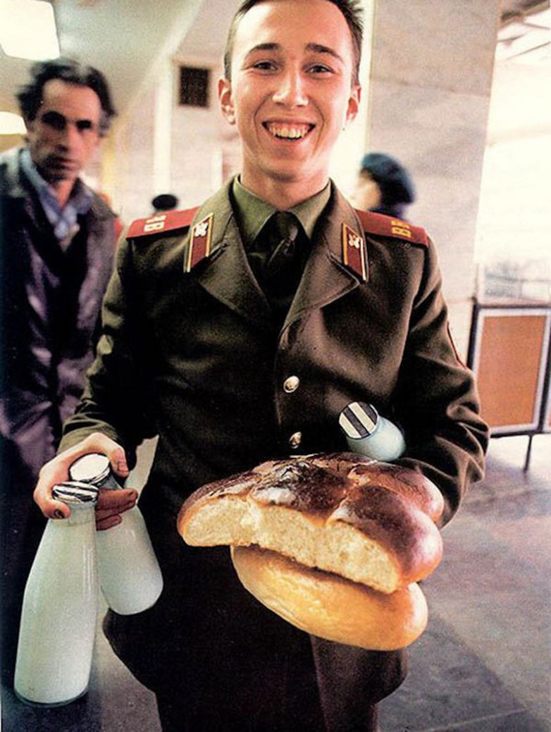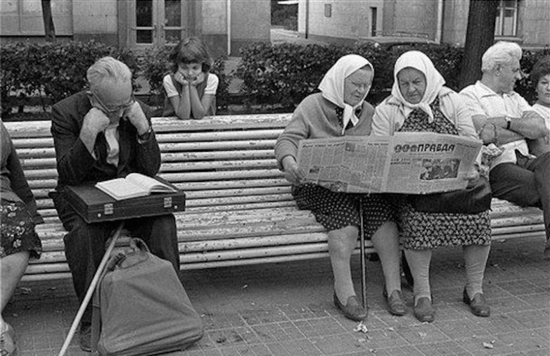 Показательны фото с газетой «Советская Россия» — перекус с молоком и хлебом и с чтением бабушками на скамейки газеты «Правда».