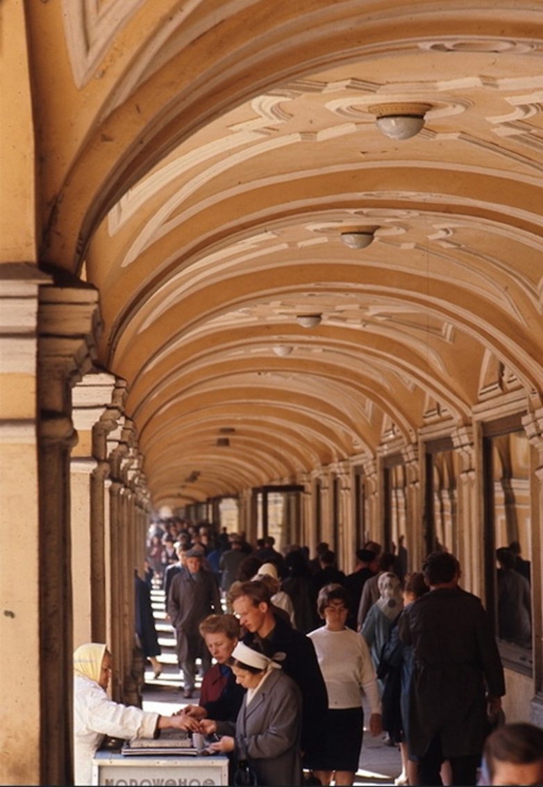 У людей лица, как сейчас: подозрительные, неулыбчивые. Смущённо улыбается одна продавщица (наверно, недавно из деревни приехала) и одна бабушка. Я приехал впервые в Ленинград в 1970 году во время белых ночей. Сразу познакомился с девушкой. Она оказалась из Москвы. Мы ещё потом в Москве какое-то время встречались, да и жили рядом: она на Войковской, а я на Водном Стадионе. Да, мир тесен. Ленинград в то время был, как и на фотографиях, красив и ухожен.