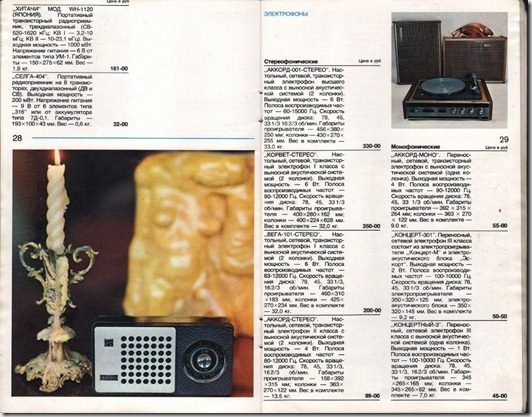 У нас в городе не было магазина Берёзка, поэтому радиотовары и фото-кинотовары указанные в каталоге, в то время продавались в обычных магазинах. В 1972 году покупал кинокамеру Экран-4 за 160 рублей, кинопроектор Волна -90 рублей, фотоаппарат Зенит с объективом Индустар 50 — 66 рублей, объектив Юпитер 11 за 20 рублей, радиоприёмник ВЭФ-206 — 116 рублей. А вот чтобы купить магнитофон Юпитер-202 стерео, пришлось ехать в Киев.