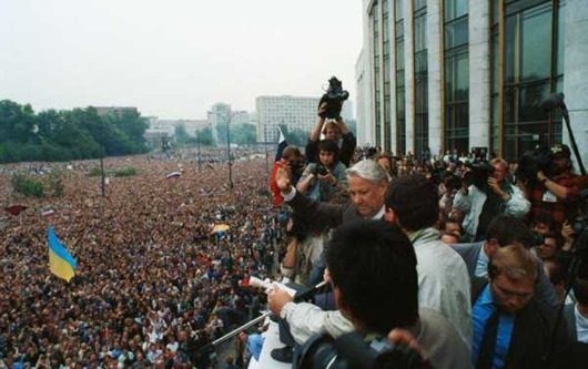 Все три дня, 19-21 августа, пока продолжался организованный ГКЧП путч, сторонники Бориса Ельцина проводили массовые манифестации в Москве. Акция 20 августа на площади у Белого дома.