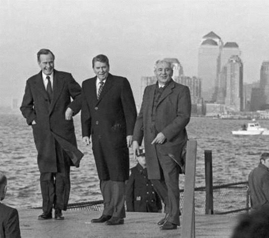 Михаил Горбачев, Рональд Рейган и Джордж Буш в адмиральском доме на острове Гавернорс-Айленд.