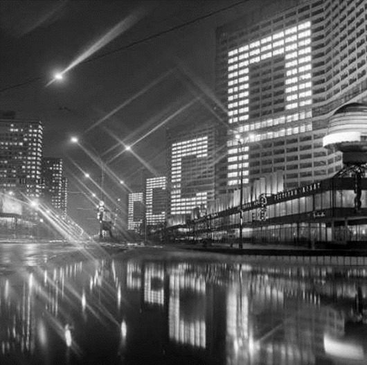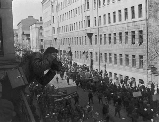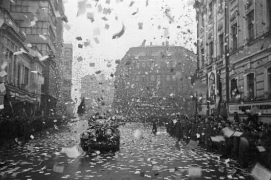 Прибытие в столицу покорителей Северного полюса Папанина, Ширшова, Кренкеля и Федорова. Автомобили с героями проезжают по улице Кирова под дождем приветственных листовок.