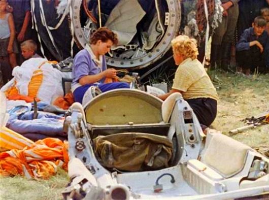 Первая женщина-космонавт Валентина Терешкова (в центре) после приземления.
