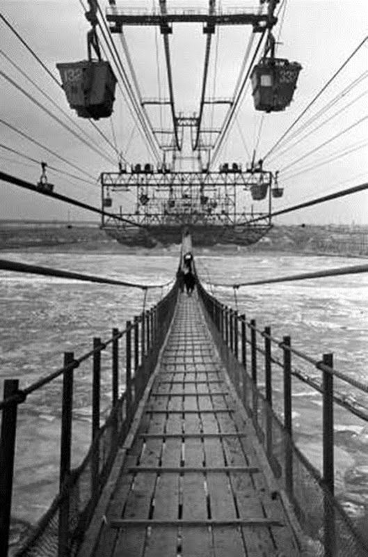 Сталинград. Строительство Волжской ГЭС им. В. И. Ленина. Подвесная канатная дорога и пешеходный мост через Волгу.