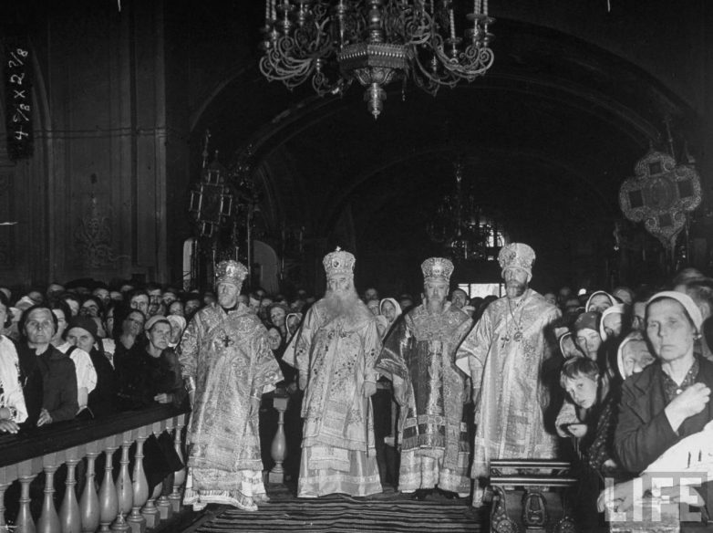Главы русской православной церкви во время службы ( митрополит Киевский Николай, патриарх Сергий, митрополит Ленинградский Алексий).