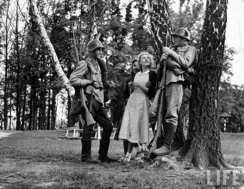 Киноактриса Любовь Орлова с актерами одетыми в форму солдат во время перерыва. Фильм снимает муж актрисы Григорий Александров.