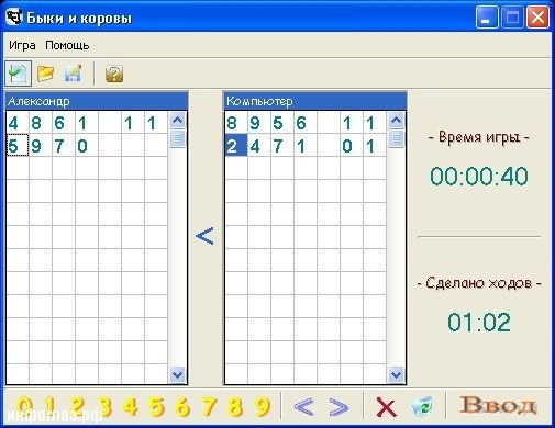 Например, первый игрок задумал 6109, а второй игрок назвал 0123. То первый игрок должен сказать: один бык и одна корова (1б,1к).