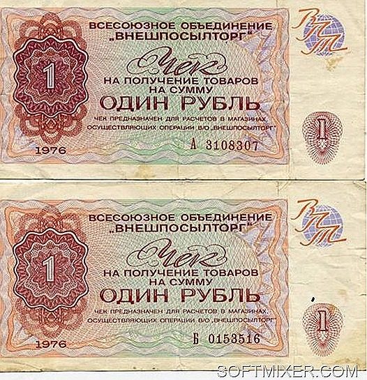 Так государство создало систему чеков для иностранных работников. Номинал каждого чека мог составлять от 1 копейки до 100 рублей. В результате этого, уже в скором времени все загранработники, от послов до военных консультанстов, стали получать зарплату чеками. Правда, часть валюты гражданину Минфин все же выдавал — для текущих трат. Основной объем своего заработка граждане все же получали в чеках, которые выдавались им уже по возвращению на великую родину.