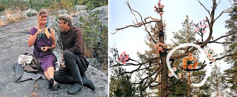 Видимо, этот фильм снимался во времена дефицита, реквизит раздобыть было не так просто. Наверное, поэтому коврик со стены любовника Кати вдруг появляется на пикнике.