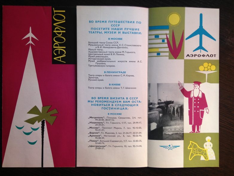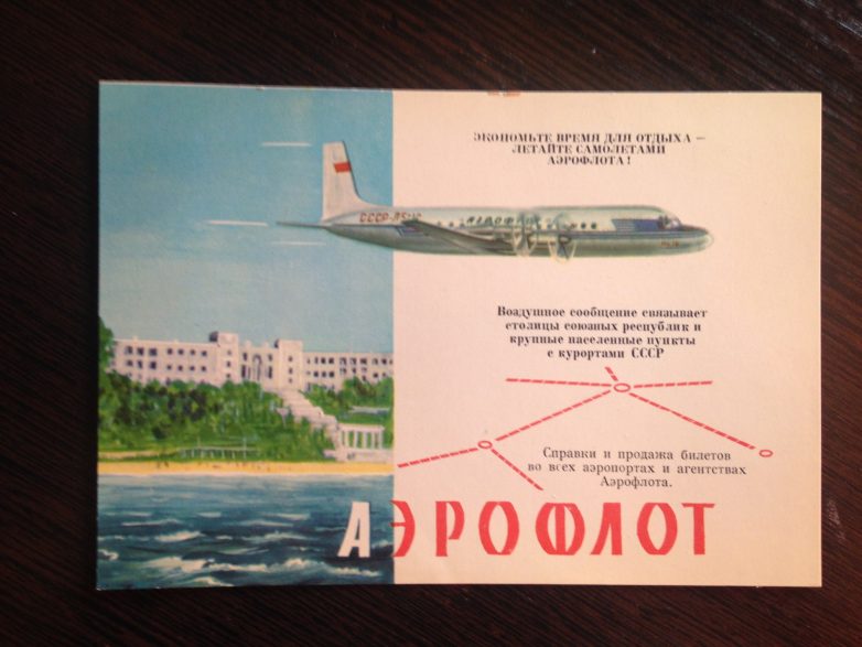 Самой известной в 60-е годы была, пожалуй, реклама АЭРОФЛОТА. Начиная от маленьких календарей, открыток, брошюр, реклама размещалась на плакатах, транспарантах на стенах домов, украшала своим неоновым светом ночной город.