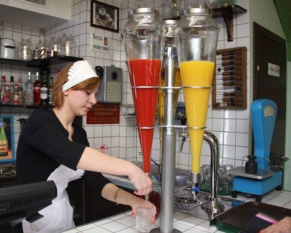 Там стоял серый металлический трехрогий миксер с никелированными стаканами, который ревел как турбина. Еще там была стойка с тремя стеклянными конусами. Внизу у конусов были краники. А в конусах были разные соки.
