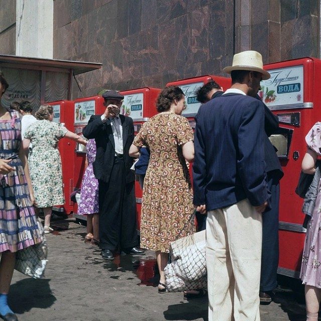 На многих фото, сделанных иностранцами люди у автоматов с питьевой водой. Для них это было действительно интересно или дико? Некоторые утверждают — это признак здорового и сплоченного общества. А знаменитый граненый стакан, создание скульптора Мухиной, стал символом древней «братины» (ковша с питьем, который на гуляньях в древней Руси пускали по кругу). Символично, но, в дальнейшем стало небезопасно, видимо. Появились питьевые фонтанчики, а потом и одноразовая посуда. Народ стал индивидуализироваться, обособляться:-) Слова-то, какие корявые:-) Колхозы стали исчезать, «красные директора» превратились в индивидуалистов-капиталистов. Впервые оказавшись во Франции в 1980 году по приглашению французских коммунистов, удивился простоте их нравов. Собрания проводили в кафе за пивом, документы — белая картонка с фото, мысли — фривольные. И повезли они нас на Пляс Пигаль, Сен-Дени — улицы «красных фонарей» и в кинотеатры с фильмами-перманентами. В глазах советских коммунистов был ужас и отвращение их нормами морали. Ну а вот сейчас — ничего, привыкли:-)))