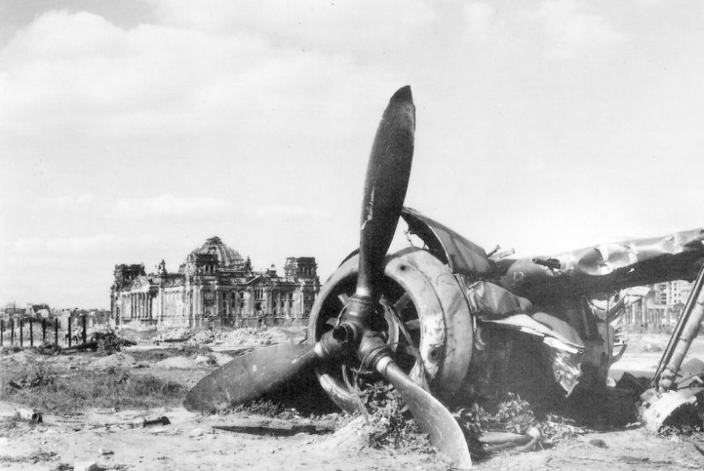 Обломки немецкого истребителя Fw 190 на фоне Рейхстага.