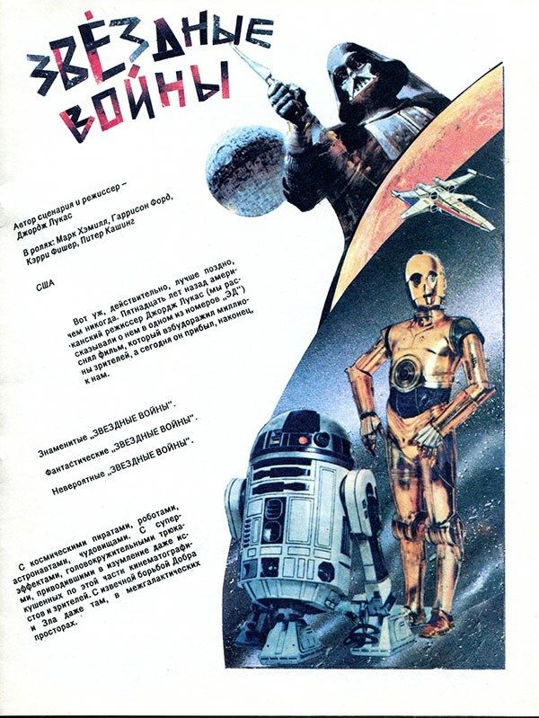 «Нынешним летом американские кинотеатры захлестнула новая волна „кинопсихоза“. По сообщению печати, фильм американского режиссера Джорджа Люкаса „Война звезд“ побивает все рекорды кассовых сборов. <...> Итак, на смену „нечистой силе“, массовым катастрофам и гигантским акулам на американский экран пришли ужасы поистине космического масштаба — чудовищные тираны, терроризирующие нашу Галактику. Борьбу с ними ведут герои фильма — некая круглолицая принцесса, деревенский юноша, старый рыцарь Круглого стола, человек-обезьяна и два робота. Один из них, громадный позолоченный робот Трипио, наделен человеческой речью, другой, Арту-Дету, похож на автомобиль и изъясняется „звездными“ сигналами…