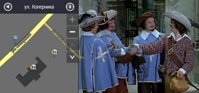Места сражений и свиданий бравых мушкетеров режиссер Юнгвальд-Хилькевич решил отснять в украинском Львове. Старые улочки этого города действительно напоминают Европу. Существует даже специальная экскурсия «Львов мушкетерский». На карте «Прогорода» находим адрес: ул. Коперника, 15. Это и есть дворец Де Тревиля – капитана королевских мушкетеров. В действительности – дворец Потоцких, возведенный в 1880 году.