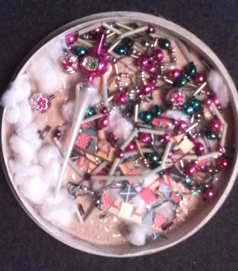 А здесь — гирлянды, стеклянные и бумажные, и верхушка на елку… Диаметр коробки — см 15-17