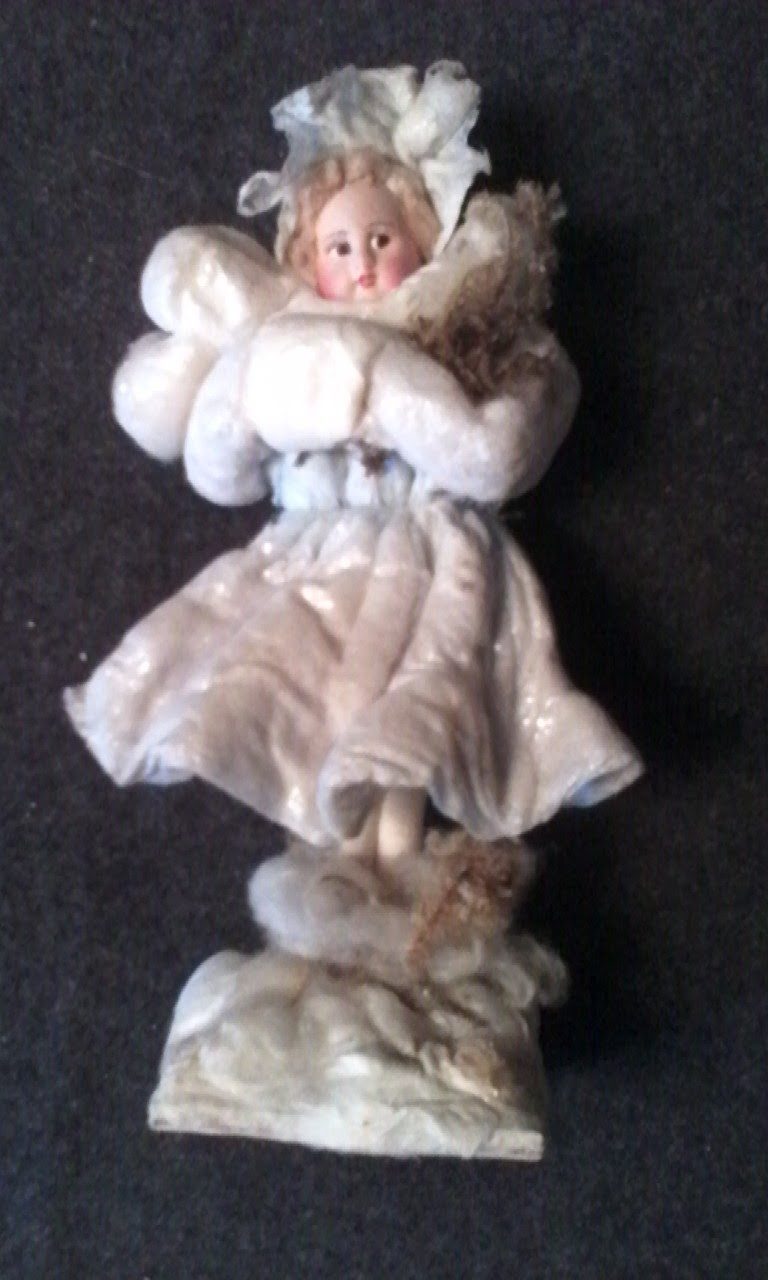 А это Снегурочка… С муфтой… Одежда напоминает папье-маше, личико расписано вручную… В руках держит кусочек мха кстати. У кого были подобные, кто вспомнит?