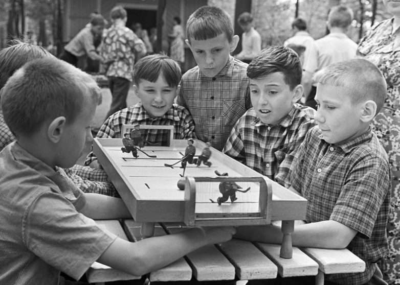 1963 год, дети играют в настольныи хоккеи на специальнои площадкедля настольных игр в парке Горького