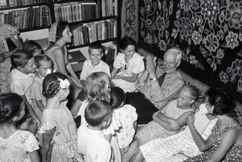Писатель Корней Чуковский на своей даче в Переделкине с читателями (1951