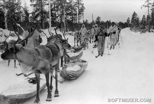 Финские лыжники с оленями и волокушами на привале во время отступления.