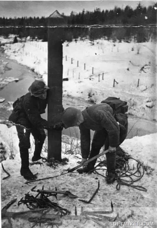 Советские солдаты выкапывают финский пограничный столб близ погранзаставы Майнила.