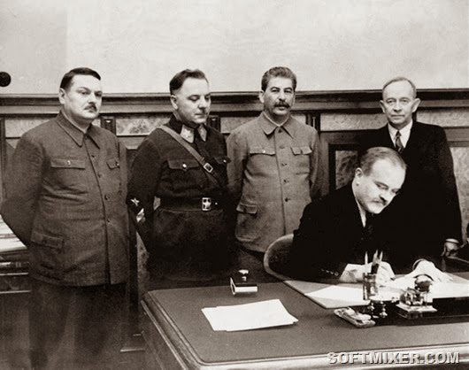 Вячеслав Молотов подписывает договор о взаимопомощи и дружбе с правительством Куусинена. За ним стоят (слева направо): А.А. Жданов, К.Е. Ворошилов, И.В.Сталин, О.В.Куусинен (глава марионеточного правительства «Финляндская Демократическая Республика»).
