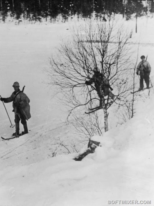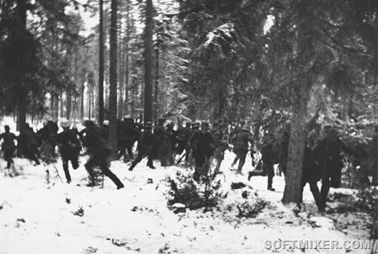 Финские солдаты в лесу пытаются рассредоточиться, заметив приближение советских самолетов.