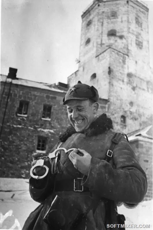 Советский офицер рассматривает финские наручники, найденные в Выборгском замке.