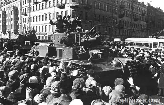 Жители Ленинграда приветствуют танкистов 20-й танковой бригады на танках Т-28, возвращающихся с Карельского перешейка/