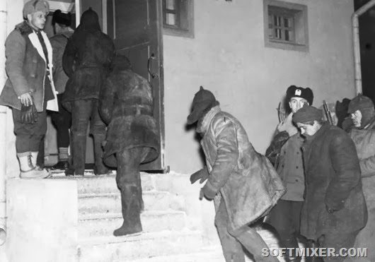 Пленные красноармейцы заходят в дом под конвоем финских солдат.