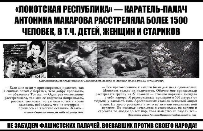 Распорядок дня Антонины Макаровой был таков: утром расстрел 27 человек из пулемёта, добивание выживших из пистолета, чистка оружия, вечером шнапс и танцы в немецком клубе, а ночью любовь с каким-нибудь смазливым немчиком или, на худой конец, с полицаем.