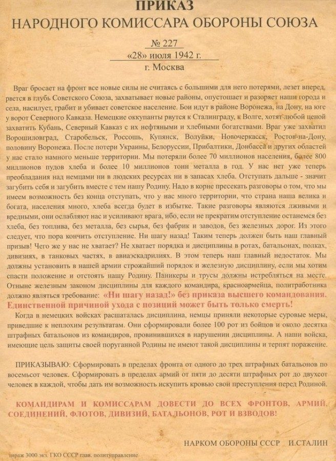 Да, мы отступали, но отступали по приказу Ставки и в то же время усиливали своими резервами наиболее опасные направления. Отход наших войск по приказу Ставки на Дон так вскружил голову Гитлеру, его фельдмаршалам и генералам, что они уже считали Советскую Армию разбитой и бросили главные силы на Кавказ. Но когда опомнились и начали усиливать Сталинградское направление, то было уже поздно. Сталинградцы отбили более 700 атак отборных войск Гитлера, перемололи его людей и технику, а затем нанесли сокрушительное поражение всем войскам на южном крыле советско-германского фронта.Вам не нравится приказ №227? Я это знаю. У вас в этом вопросе много единомышленников из генералов вермахта. Генерал Дёрр в своем труде «Поход на Сталинград» на странице 30-й пишет: «Приказ Сталина был характерен стилем изложения: отеческий тон обращения к солдатам и народу… Никаких упреков, никаких угроз… Никаких пустых обещаний… Он возымел действие. Примерно с 10 августа на всех участках фронта было отмечено усиление сопротивления противника».