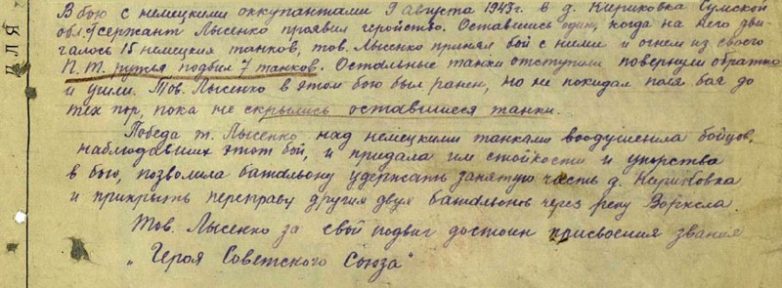 9 августа 1943 года бронебойщик старший сержант Лысенко вступил в единоборство с пятнадцатью немецкими танками и вышел из него победителем.
