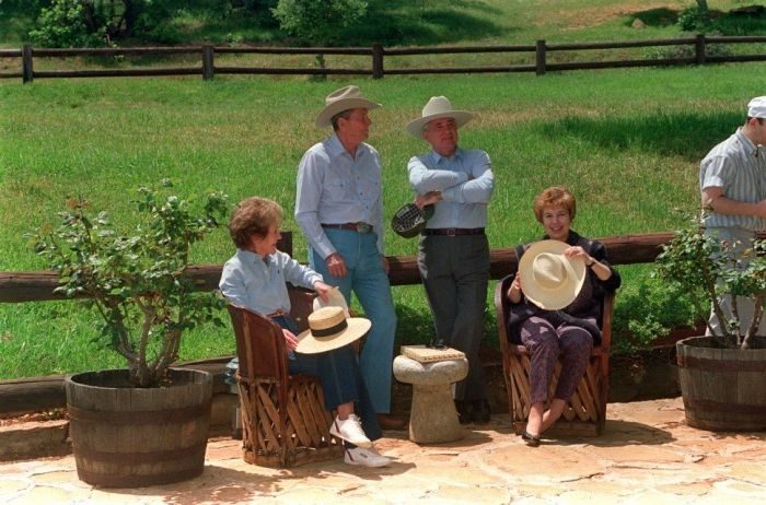 Бывшие мировые лидеры Рейган и Горбачев расслабляются на ранчо Рейгана в Санта-Барбаре в мае 1992 года, всего через 5 месяцев после отставки Горбачева. После новостей о смерти Рейгана в 2004 году, Горбачев отозвался о нем как о «великом президенте» и сказал что эти новости его «очень расстроили».