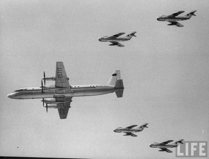 Ил -18 с Гагариным на борту и четыре сопровождающих самолета на пути в Москву