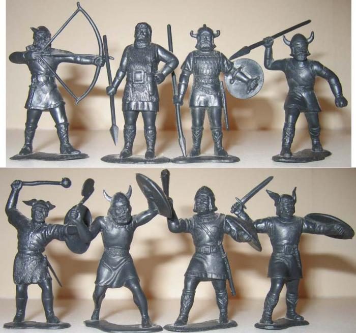 согласно описанию автора — у меня были Ижевские солдатики(в основном, т.к. были отдельные другие) — был целый набор в коробке, под названием «Наша армия родная». Витязи с мечами мне не нравились, т.к. древность я не люблю и невозможно играя поставить вместе витязя и современного воина с автоматом. Поэтому я их старался сменять при первой возможности. Викингов и ковбоев в моём детстве ещё не было.