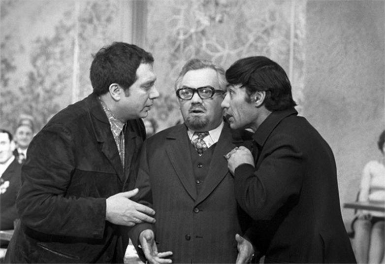 Артисты из телевизионного театра миниатюр «Кабачок тринадцать стульев»: Зиновий Высоковский, Борис Рунге и Спартак Мишулин во время записи праздничной телепередачи «Голубой огонек». 1974 год. Фото С. Герасимова /Фотохроника ТАСС/