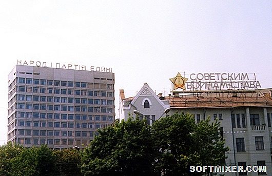 Здания, украшенные вдохновляющими словами: «Партия и народ – едины!» и «Советским воинам — слава!». Киев, 1977 год.
