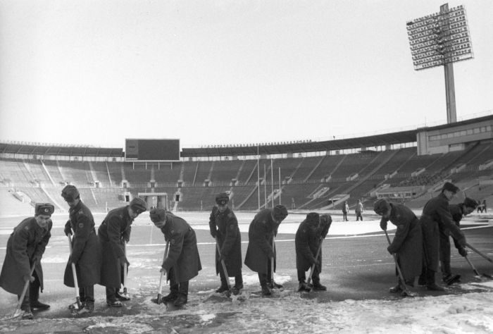 Из-за непогоды на такой значительный матч была раскуплена лишь пятая часть билетов, так что для зрителей расчистили и открыли только 2 трибуны из 4-х – мест на них хватало за глаза. Однако, опять же, по причине холода болельщики в основном заняли трибуну C, которая была ближе к метро. На этом фото 1982 года видна центральная трибуна (A), самая дальняя от метро, где сидело меньшинство болельщиков. Большинство занимали южную трибуну © напротив.